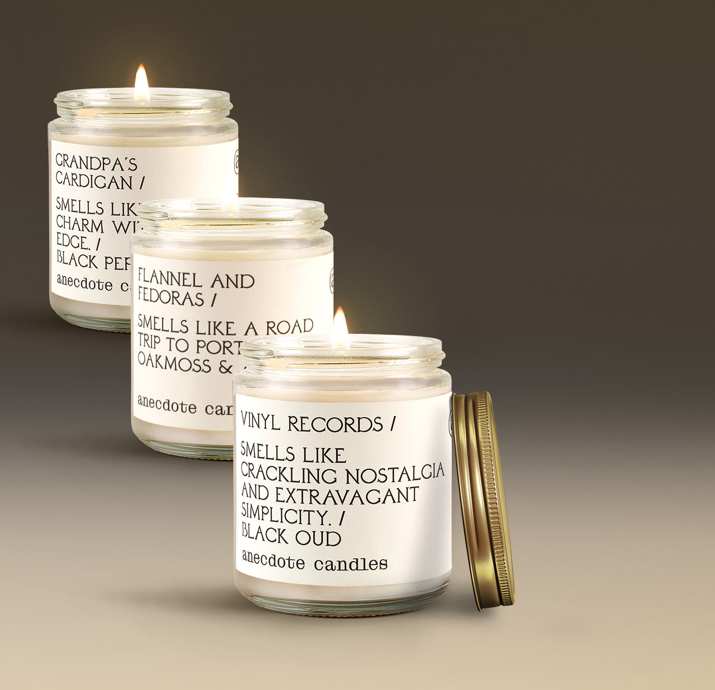 Unisex scents that make the perfect gift for those who always drink coffee out of a mason jar. This bundle features three of our standard glass jars: Flannel and Fedoras, Grandpa's cardigan, and Vinyl Records. Bundle and save when you buy all three.
